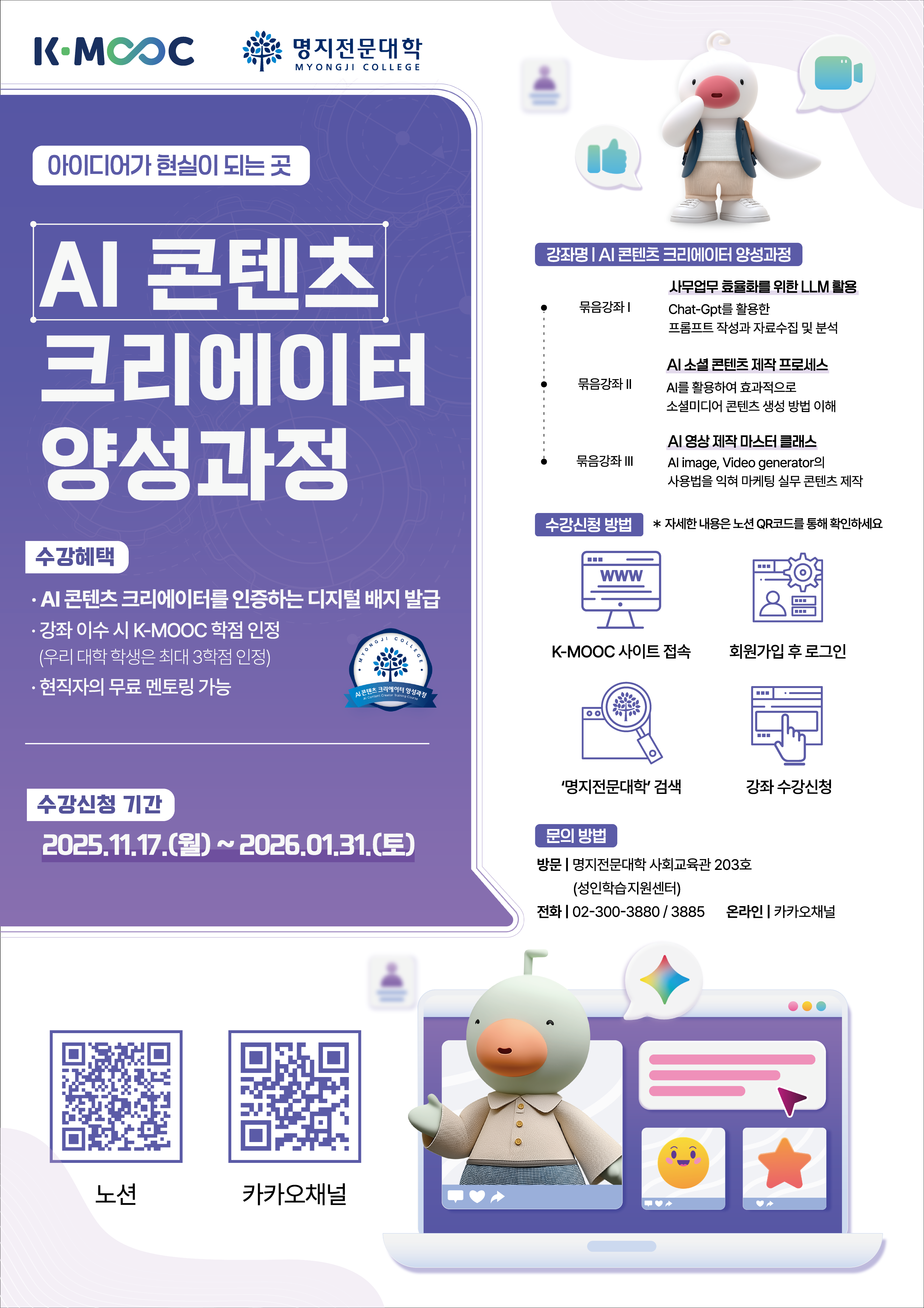 - K-MOOC 사이트 접속 → 회원가입 후 로그인 → '명지전문대' 검색 → 강좌 수강신청