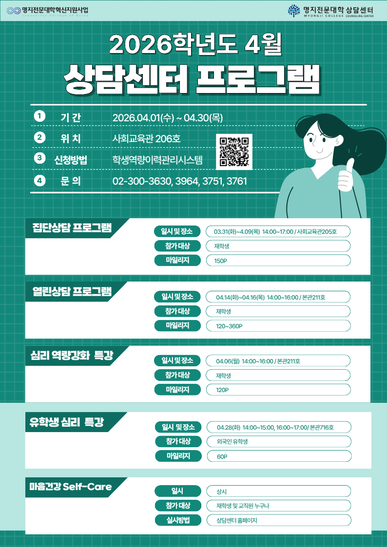 ▶▶신청 바로가기 : https://mpu.mjc.ac.kr/Career/CounselCenter/CounselCenter.aspx